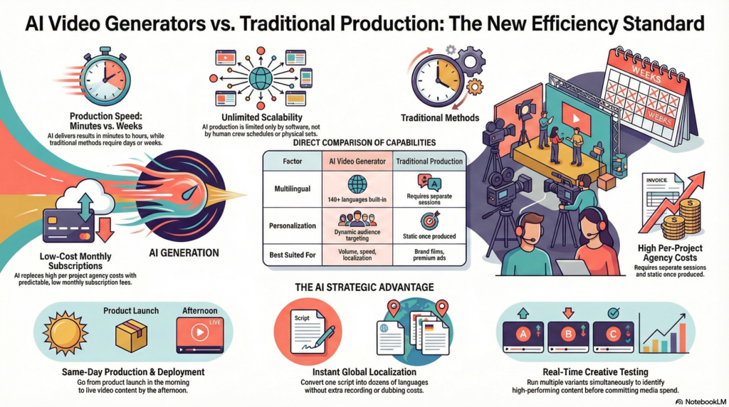 Before AI video tools reached their current maturity, a mid-size business producing localized video for three regional markets was looking at three separate shoots, three sets of voiceovers, and three rounds of editing. In 2026, the same output is generated by a single script and completed in hours. The growth of the AI video generator market has made this kind of scale not just possible but expected. The cost reduction is real, the speed advantage is real, and for businesses that need volume, the scale advantage is simply not comparable. Traditional production cannot replicate what AI delivers in that scenario, and most marketing teams have already made the shift.